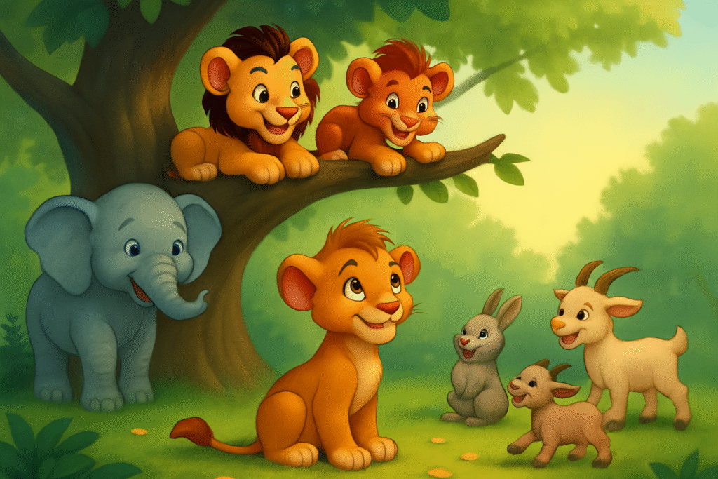 बहुत समय पहले की बात है। एक बड़ा, हरा-भरा जंगल था, जहाँ पेड़-पौधे झूमते रहते थे, फूलों से भीनी-भीनी खुशबू आती थी और चारों तरफ पक्षियों की चहचहाहट सुनाई देती थी। इस जंगल में बहुत सारे जानवर रहते थे – कोई पेड़ों पर कूदता, कोई जमीन पर दौड़ता, कोई पानी में तैरता।