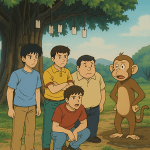 लेकिन फिर बंदर ने कहा – “अगर इस जंगल से सही-सलामत बाहर जाना है, तो तीन परीक्षा पास करनी होंगी। वरना यहीं सड़ोगे।”