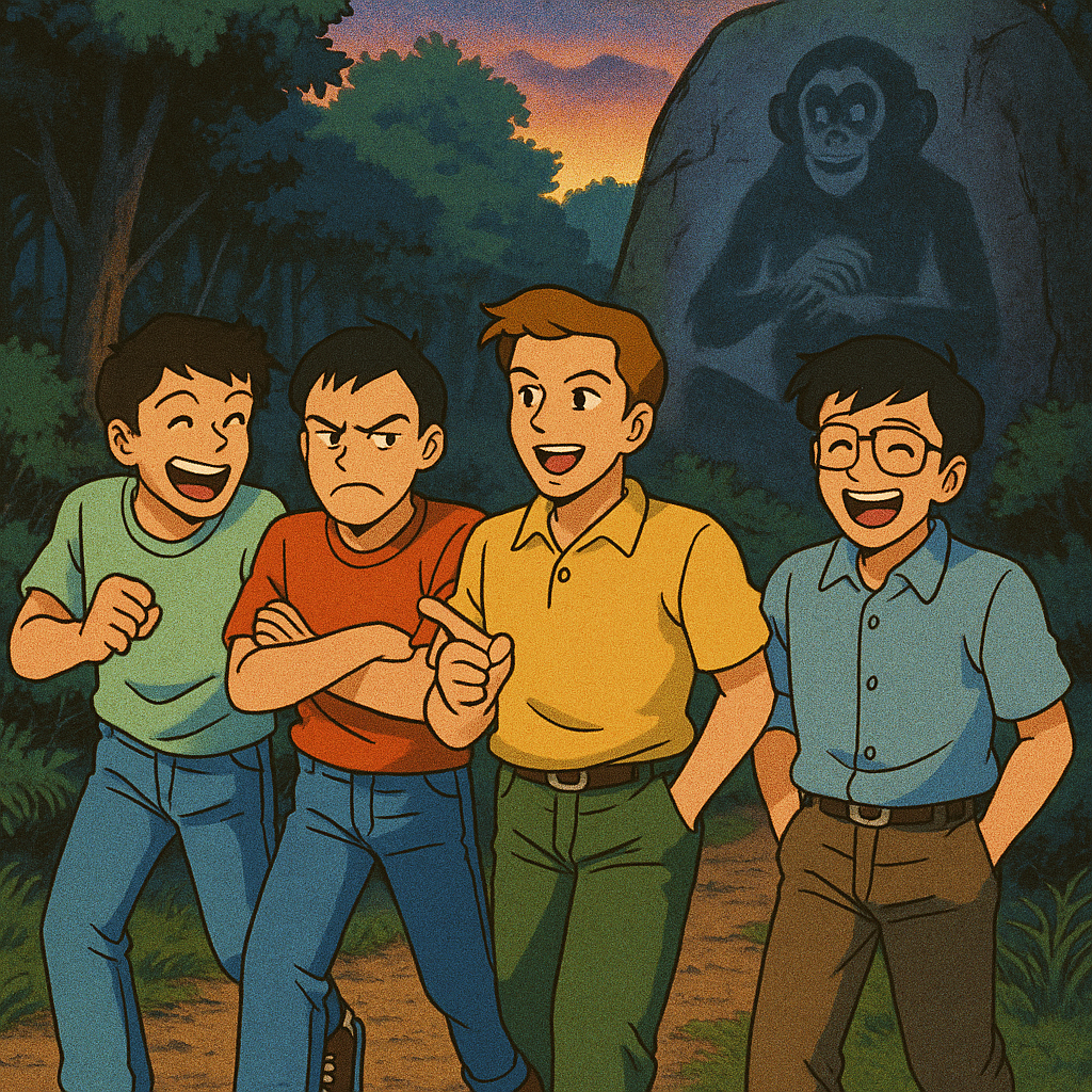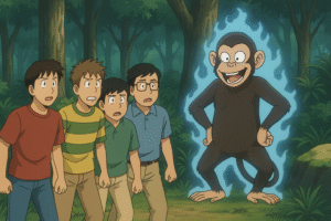 चारों दोस्त मगरमच्छों वाला पुल पार करके थोड़ा आराम कर ही रहे थे कि बंदर फिर से पेड़ों से लटकता हुआ आ गया। इस बार उसके चेहरे पर न कोई मज़ाक, न कोई मस्ती… बस एक रहस्यमयी मुस्कान थी।